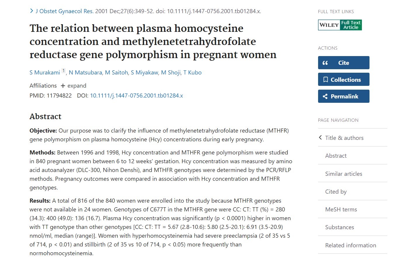 Nel 2002, un ampio studio di coorte giapponese (840 donne, 6-12 settimane di gestazione) pubblicato su The Journal of Obstetrics e La ricerca in Ginecologia ha consolidato la catena: TT → aumento di Hcy → gravidanza avversa risultati.