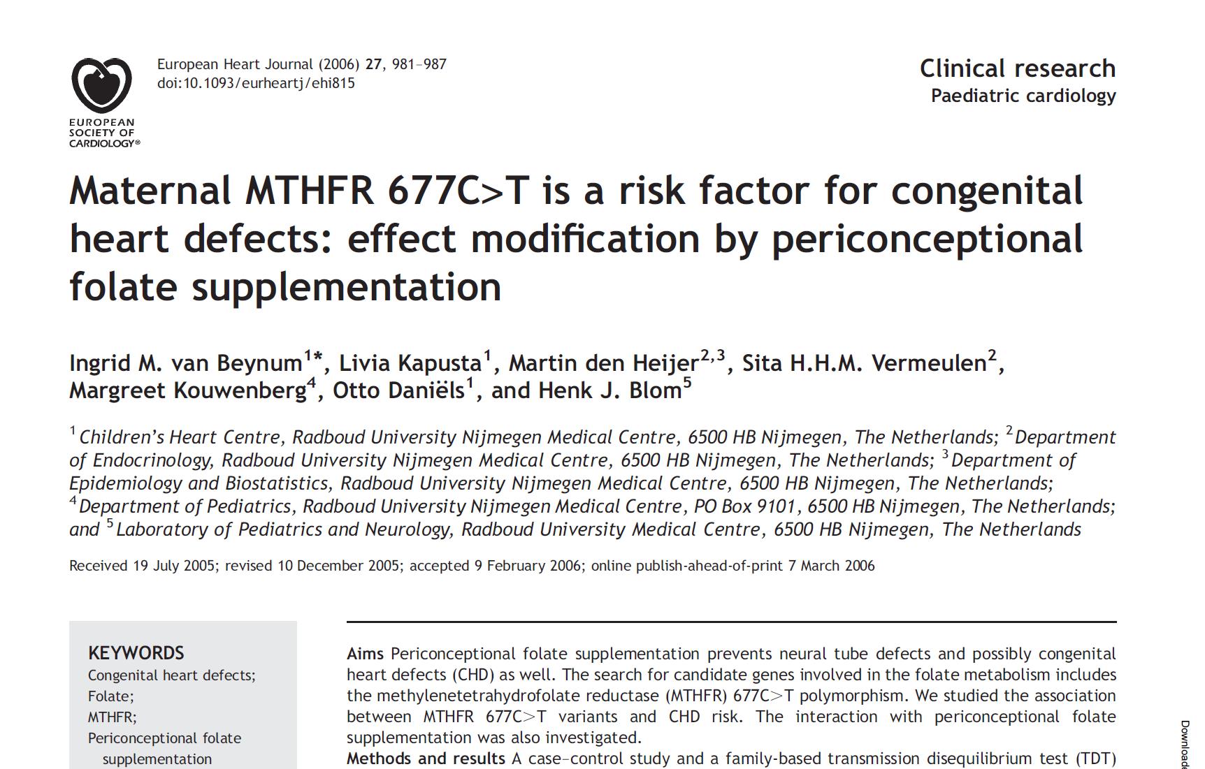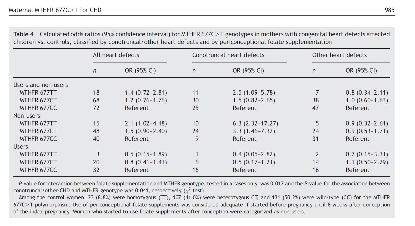 Tra 165 famiglie con congenite malattie cardiache (CHD) e 220 famiglie di controllo, madri portatrici di MTHFR 677 genotipo CT o TT e NON avevano assunto integratori di folati periconcezionali molte più probabilità di avere un bambino con difetti cardiaci di tipo conduzione (OR 3,3 e 6.3, rispettivamente).