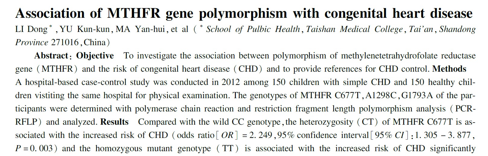 Uno studio dell’ospedale pediatrico Qilu di Shandong L'università ha dimostrato che l'allele T di MTHFR C677T aumenta le probabilità di CHD di 1,8 volte; I genotipi TT e CT spingono il rischio a 3,1 e 2,2 volte.