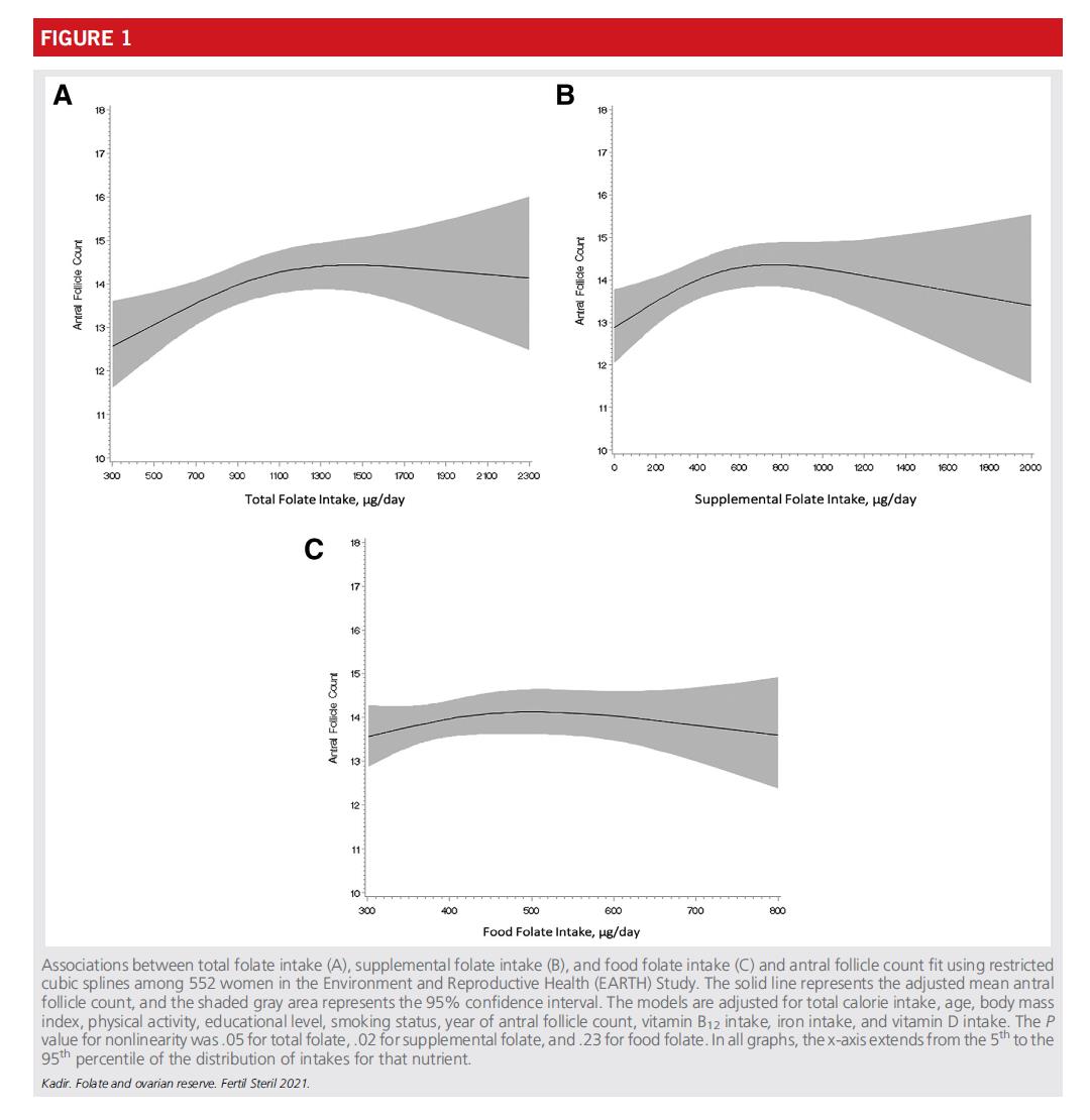 I dati hanno indicato che la correlazione positiva tra l'assunzione totale di acido folico e l'AFC raggiungono un plateau approssimativamente1200 microgrammi al giorno. Il massimo beneficio derivante dall'assunzione di acido folico tramite integratori (acido folico, sintetico acido folico) si verifica a circa800 microgrammi al giorno. Rispetto alle donne con un quotidiano assunzione di 400 microgrammi di acido folico, quelli che consumano 800 microgrammi al giorno si prevede un incremento di circa1,5 follicoli.