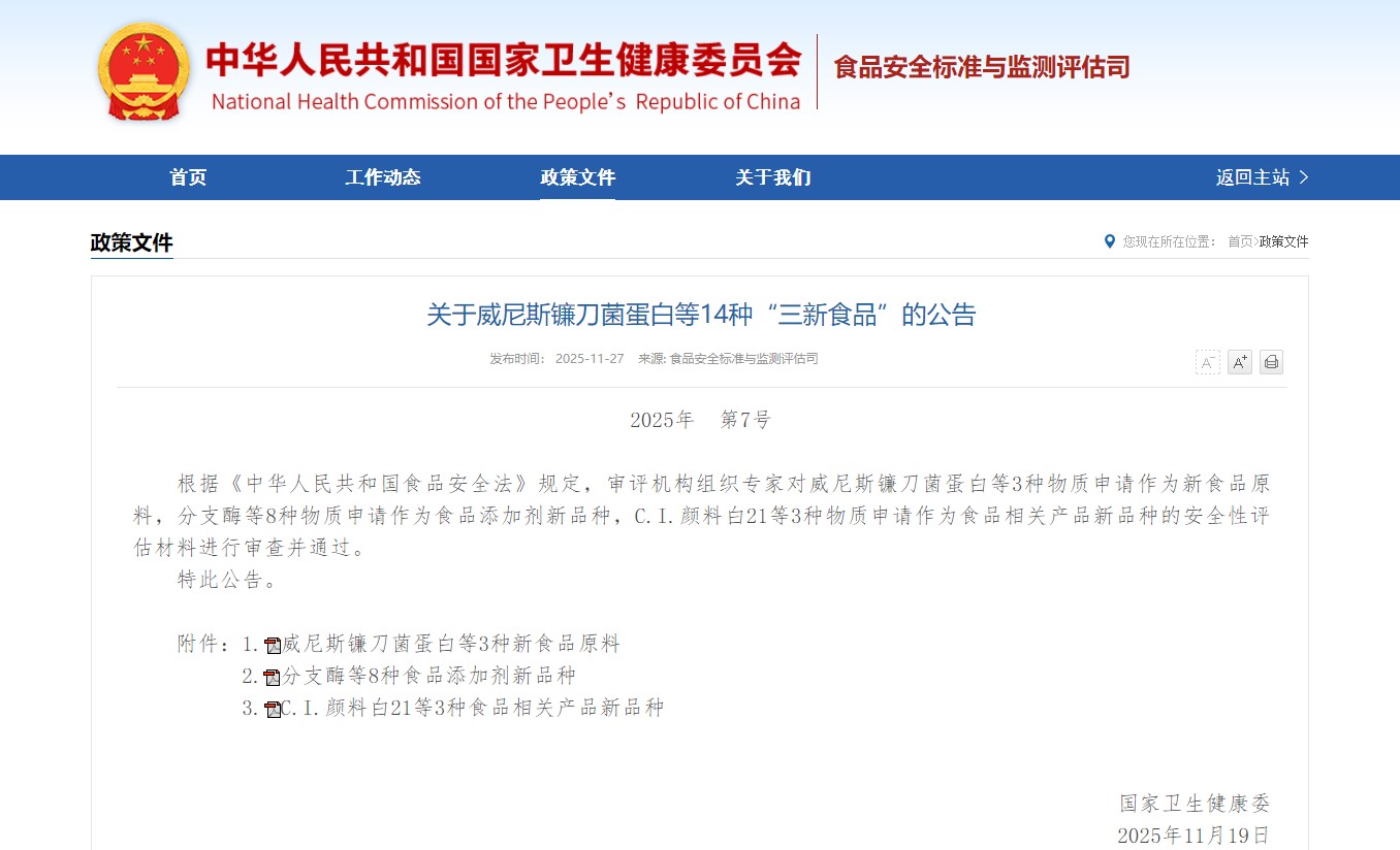 [1] Commissione sanitaria nazionale della Repubblica popolare cinese.Annuncio su 14 "Tre nuovi alimenti" tra cui la proteina Fusarium veneziana (2025, N. 7).